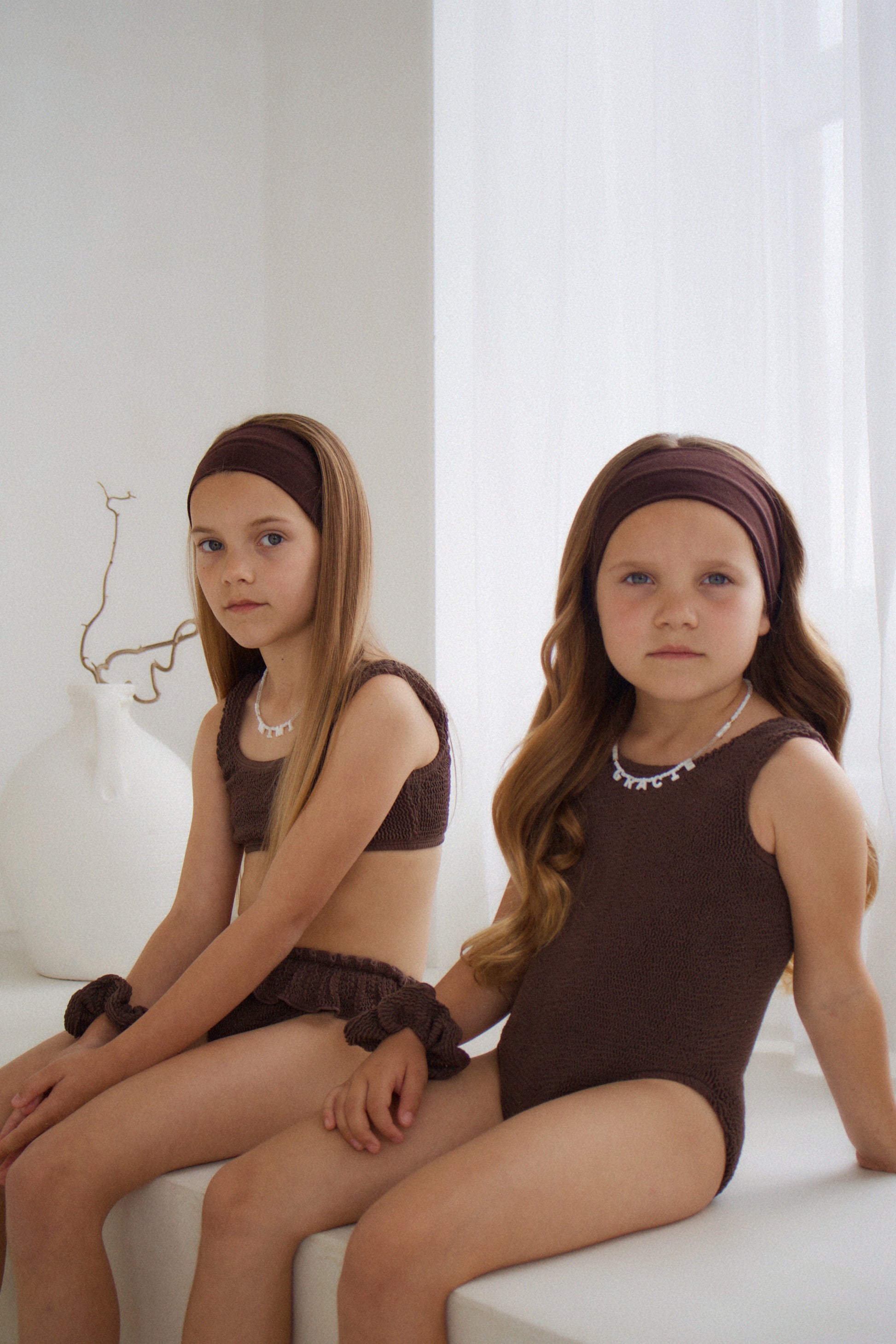 Our iconic bikini in brand new colourway, cocoa! Perfect for the neutral lovers. This bikini features our classic top and ruffle bottoms. Made in our signature soft crinkle fabric, designed to stretch with your little one.